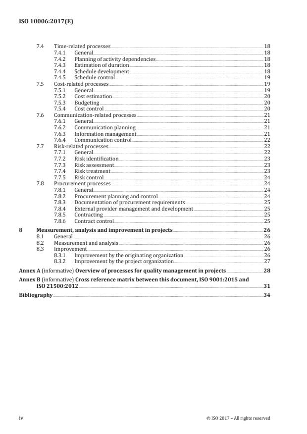 – sistemi vodenja kakovosti v projektih zajemajo: značilnosti projekta (4.1); načela vodenja kakovosti v projektih (4.2); postopke vodenja kakovosti v projektu (4.3); in načrt kakovosti za projekt (4.4).