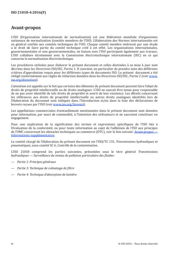 ISO 21018-4:2016 is a standard published by the International Organization for Standardization (ISO). Its full title is "Hydraulic fluid power — Monitoring the level of particulate contamination in the fluid — Part 4: Use of the light extinction technique". This standard covers: ISO 21018-4:2016 specifies a method for the determination of the particulate contamination level using the light extinction technique (also known as light blockage or light obscuration) either online or off-line in containers. It also defines procedures for calibrating the instruments and verifying their correct operation both in the laboratory and in service. In general, the techniques described in ISO 21018-4:2016 are suitable for monitoring - the general cleanliness level in hydraulic systems, - the progress in flushing operations, and - support equipment and test rigs. The use of this method is applicable to single-phase liquid systems only.