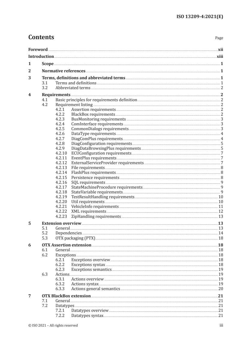 - Extension requirements (Clause 4): A structured listing of extension requirements derived from OTX Part 1 use cases, covering assertion, communication, diagnostics, and more.
