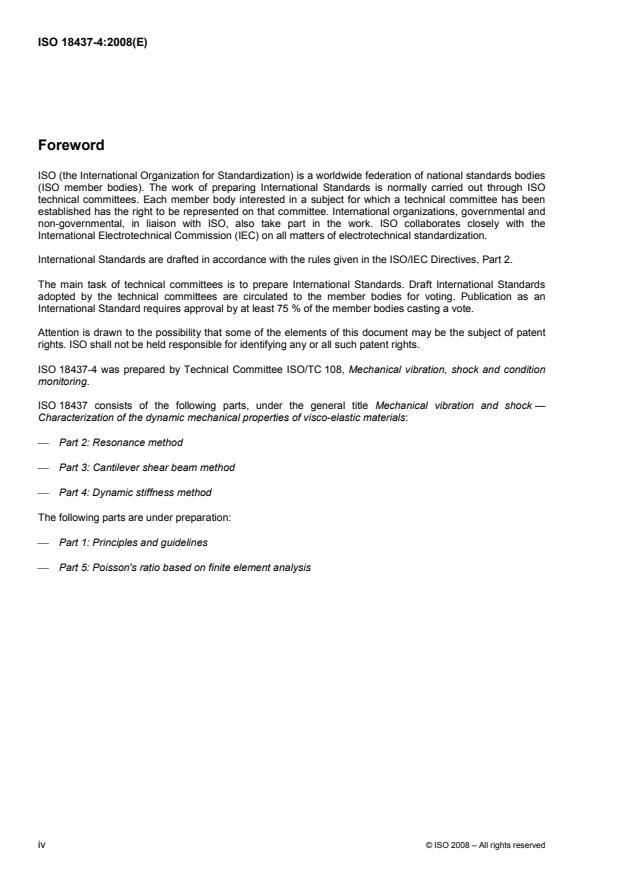 ISO 18437-4:2008 is a standard published by the International Organization for Standardization (ISO). Its full title is "Mechanical vibration and shock - Characterization of the dynamic mechanical properties of visco-elastic materials - Part 4: Dynamic stiffness method". This standard covers: ISO 18437-4:2008 specifies a direct method for measuring the complex dynamic moduli of elasticity (the Young, shear and bulk moduli, and their respective loss factors corresponding to the tensile, shear and all compressive strains) for polymeric (rubbery and viscous polymers, as well as rigid plastics) materials over a wide frequency and temperature range. Measurements are performed by the dynamic stiffness method, which uses electric signals from sensors attached to a test piece. These signals are proportional to the dynamic forces acting on the test piece and the strains in the test piece due to the effect of these forces. The measurement frequency range is determined by the size of test piece, the accuracy required on the dynamic modulus measurements, the relationship between the stiffness of the oscillation generator and the stiffness of the test piece, and by the resonance characteristics of the test fixture used. The method presented in ISO 18437-4:2008 allows measurement under any static pre-load allowed for the test piece (including the test piece having the non-linear characteristics under different static loads), but under small dynamic (acoustic) strains, i.e. in limits where the linear properties of the test piece are not distorted. Depending on the pre-load conditions, the relation between the moduli is unique.