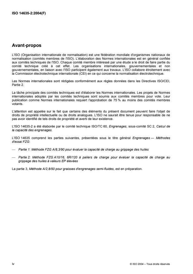 ISO 14635-2:2004 is a standard published by the International Organization for Standardization (ISO). Its full title is "Gears — FZG test procedures — Part 2: FZG step load test A10/16, 6R/120 for relative scuffing load-carrying capacity of high EP oils". This standard covers: ISO 14635-2:2004 specifies a test method based on an FZG four-square test machine for determining the relative load-carrying capacity of high EP oils defined by the gear surface damage known as scuffing. The method is useful for evaluating the scuffing load capacity potential of oils typically used with highly stressed cylindrical gearing found in many vehicle and stationary applications. It is not suitable for establishing the scuffing load capacity potential of oils used in highly loaded hypoid bevel gearing applications, for which purpose other methods are available in the industry.