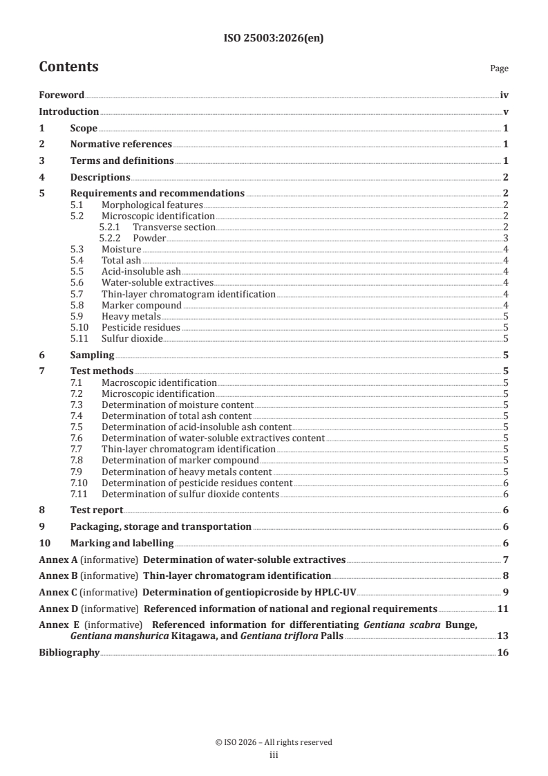 ISO 25003:2026 is a standard published by the International Organization for Standardization (ISO). Its full title is "Traditional Chinese medicine — Gentiana scabra, Gentiana manshurica, and Gentiana triflora root and rhizome". This standard covers: This document specifies the quality and safety requirements of Gentiana scabra, Gentiana manshurica, and Gentiana triflora root and rhizome. This document applies to Gentiana scabra, Gentiana manshurica, and Gentiana triflora root and rhizome that is sold and used as natural medicines in international trade, including in Chinese materia medica, in its whole medicinal material, and in decoction pieces derived from these plants.
