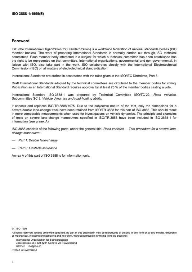 ISO 3888-1:1999 is a standard published by the International Organization for Standardization (ISO). Its full title is "Passenger cars — Test track for a severe lane-change manoeuvre — Part 1: Double lane-change". This standard covers: Passenger cars — Test track for a severe lane-change manoeuvre — Part 1: Double lane-change