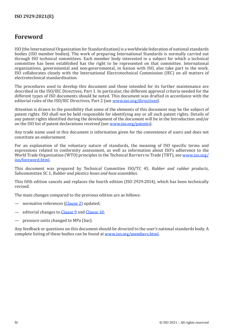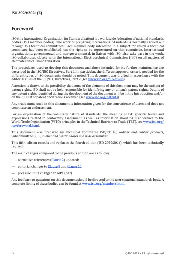 ISO 2929:2021 is a standard published by the International Organization for Standardization (ISO). Its full title is "Rubber hoses and hose assemblies for bulk fuel delivery by truck — Specification". This standard covers: This document specifies the requirements for two groups of rubber hoses and rubber hose assemblies for loading and discharge of liquid hydrocarbon fuels with a maximum working pressure of 1,0 MPa (10 bar). Both groups of hoses are designed for a) use with hydrocarbon fuels having an aromatic-hydrocarbon content not exceeding 50 % by volume and containing up to 15 % of oxygenated compounds, and b) operation within the temperature range of −30 °C to +70 °C, undamaged by climatic conditions of −50 °C to +70 °C when stored in static conditions. NOTE Hoses for use at temperatures lower than −30 °C can be the subject of discussion between manufacturer and end user. This document is not applicable to hoses and hose assemblies for LPG systems, aviation fuel systems, fuel station systems or marine applications.