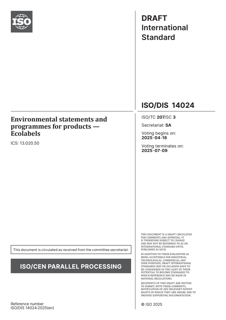 ISO/PRF 14024 - Environmental statements and programmes for products — Ecolabels/19/2025