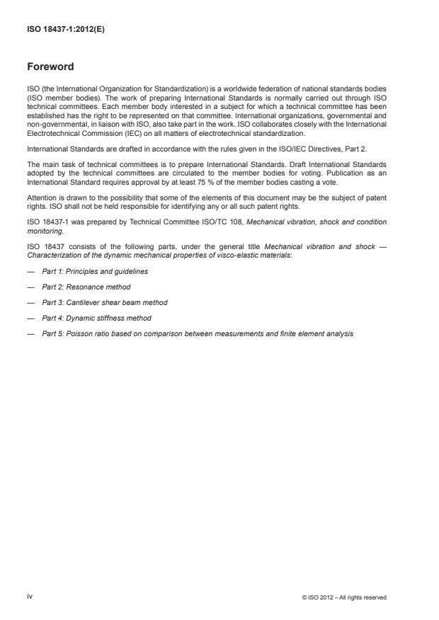 ISO 18437-1:2012 is a standard published by the International Organization for Standardization (ISO). Its full title is "Mechanical vibration and shock - Characterization of the dynamic mechanical properties of visco-elastic materials - Part 1: Principles and guidelines". This standard covers: ISO 18437-1:2012 establishes the principles underlying ISO 18437-2 to ISO 18437-5 for the determination of the dynamic mechanical properties (i.e. elastic modulus, shear modulus, bulk modulus, loss factor, and Poisson ratio) of isotropic visco-elastic resilient materials used in vibration isolators from laboratory measurements. It also provides assistance in the selection of the appropriate part of this International Standard. ISO 18437-1:2012 is applicable to isotropic resilient materials that are used in vibration isolators in order to reduce: a) the transmissions of audio frequency vibrations to a structure that can, for example, radiate fluid-borne sound (airborne, structure-borne or other); b) the transmission of low frequency vibrations which can, for example, act upon humans or cause damage to structures or sensitive equipment when the vibration is too severe; c) the transmission of shock and noise. The data obtained with the measurement methods that are outlined in ISO 18437-1:2012 and further specified in ISO 18437-2 to ISO 18437-5 can be used for: 1) the design of efficient vibration isolators; 2) the selection of an optimum resilient material for a given design; 3) the theoretical computation of the transfer of vibrations through vibration isolators; 4) information during product development; 5) product information provided by manufacturers and suppliers; 6) quality control.