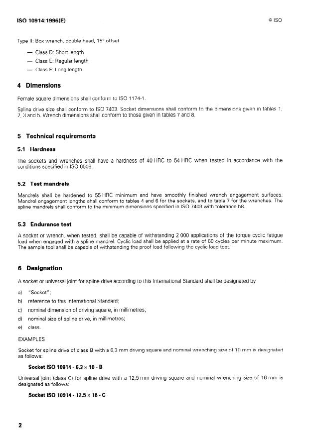 - Socket and wrench dimensions are given in the standard’s tables; female driving square dimensions must conform to ISO 1174‑1 and spline drive sizes to ISO 7403.