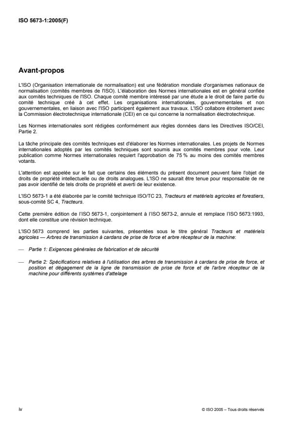 ISO 5673-1:2005 specifies the power take-off (PTO) drive shafts of a tractor or self-propelled machine used in agriculture and the power-input connection (PIC) of its implement, establishing a method for determining PTO static and dynamic torsional strength while giving manufacturing and safety requirements. It is applicable only to those PTO drive shafts and guards mechanically linked to the shaft by at least two bearings. It is not applicable to PTO drive shafts guarded by location or to the mechanical characteristics of overrun devices and torque limiters, nor are environmental aspects considered; neither is it applicable to PTO drive shafts and their guards manufactured before the date of its publication.