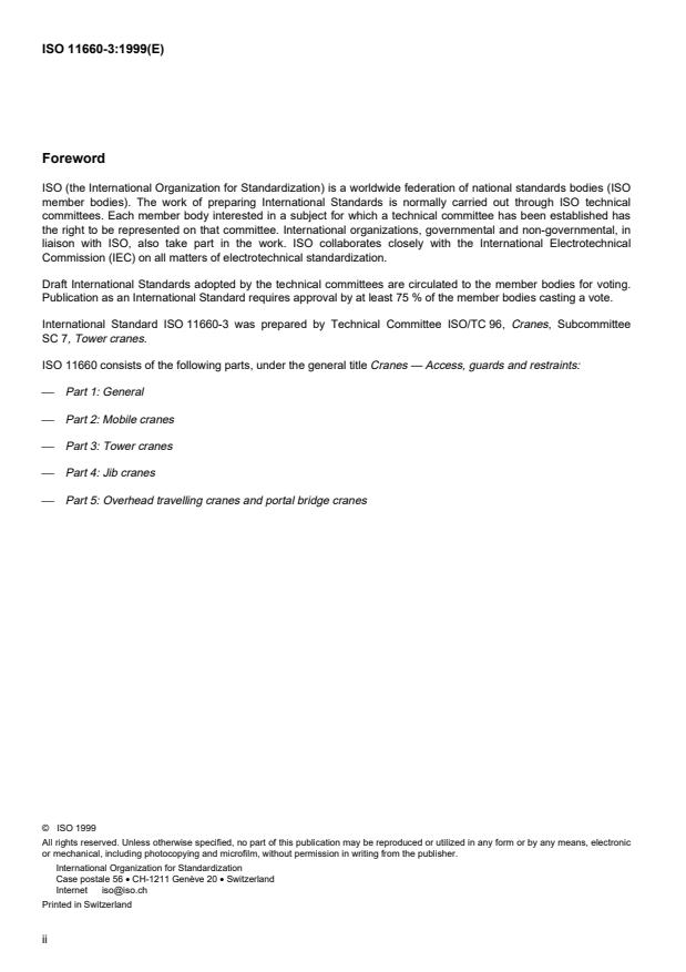 ISO 11660-3:1999 is a standard published by the International Organization for Standardization (ISO). Its full title is "Cranes — Access, guards and restraints — Part 3: Tower cranes". This standard covers: Cranes — Access, guards and restraints — Part 3: Tower cranes