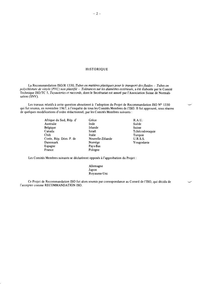 The IS0 Recommendation R 1330, Plastics pipes for the trunsport of fluids - Unplusticized polyvinyl