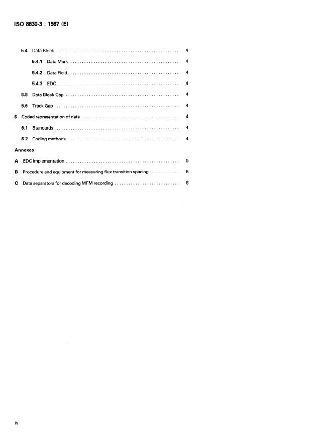 ISO 8630-3:1987 is a standard published by the International Organization for Standardization (ISO). Its full title is "Information processing — Data interchange on 130 mm (5.25 in) flexible disk cartridges using modified frequency modulation recording at 13 262 ftprad, on 80 tracks on each side — Part 3: Track format B for 80 tracks". This standard covers: Applies , as part 3 of ISO 8630, to track format B for 80 tracks. Defines the quality of recorded signals, the track layout, and a track format to be used on 130 mm (5,25 in ), 13262 ftprad flexible disk cartridges designed for data interchange between data processing system. Provides, together with ISO 8630-1, for full data interchange between data processing systems. To be used in compliance with ISO 646; 2022; 4873; 6429; 9293.