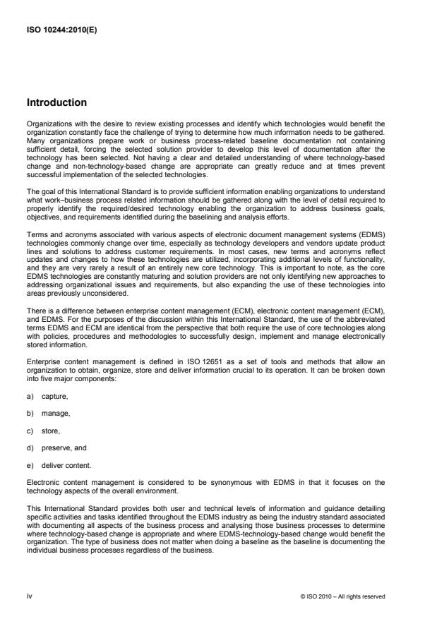 ISO 10244:2010 - Document management - Business process baselining and analysis - provides a standardized framework for documenting existing work and business processes (process baselining) and for analysing those processes to identify where technology (EDMS/ECM) or non-technology changes will add value. The standard defines the level of detail to collect, recommended documentation methods, and procedures for process evaluation so organizations can make informed decisions about process improvement and technology selection.