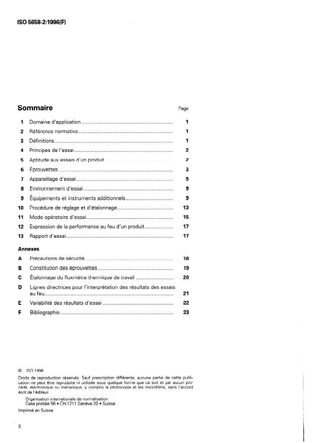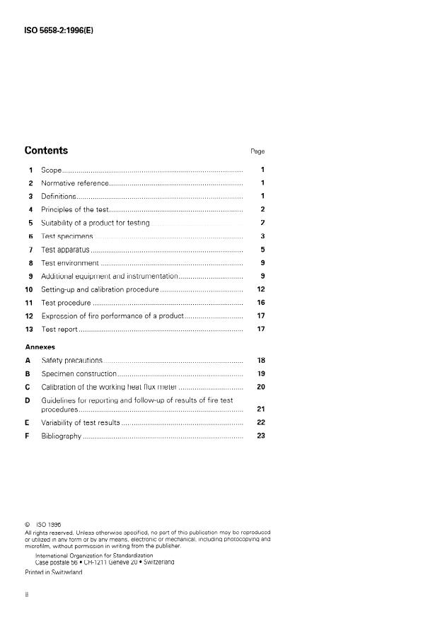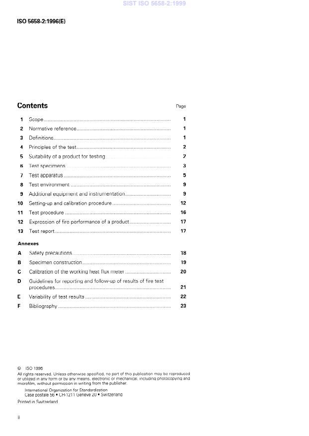 ISO 56582: 1996(E) Contents Page 1 2 3 4 5 6 7 8 9 10 11 12 13 Scope . . Normative reference. . . Definitions . . . Principles of the test . Suitability of a product for testing. . Test specimens . Test apparatus . Test environment . . Additional equipment and instrumentation . Setting-up and calibration procedure. . Test procedure . Expression of fire Performance of a product . Test report . 1 1 % 2 2 3 5 9 9 12 16 17 17 Annexes A Safety precautions. . 18 B Specimen construction . 19 C Calibration of the working heat flux meter . 20 D Guidelines for reporting and follow-up of results of fire test procedures. . 21 E Variability of test results . 22 F Bibliography . . . . . . . . . . . . . . . . . . . . . . . . . . . . . . . . . . . . . . . . . . . . . . . . . . . . . .s. 23 0 ISO 1996 All rights reserved. Unless otherwise specified, no part of this publication may be reproduced or utilized in any form or by any means, electronie or mechanical, including photocopying and microfilm, without Permission in writing from the publisher. International Organization for Standardization Case postale 56 0 CH-l 211 Geneve 20 l Switzerland Printed in Switzerland SIST ISO 5658-2:1999