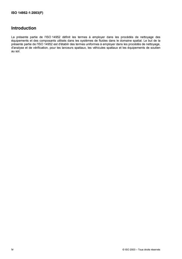 L'ISO 14952-1:2003 définit la terminologie de base à utiliser dans les procédés de nettoyage des composants et équipements utilisés dans les systèmes de fluides dans le domaine spatial. Elle est applicable à la terminologie utilisée pour décrire les procédés de nettoyage, d'analyse et de vérification des systèmes de fluides utilisés dans les équipements de soutien au sol, les lanceurs spatiaux et les véhicules spatiaux.