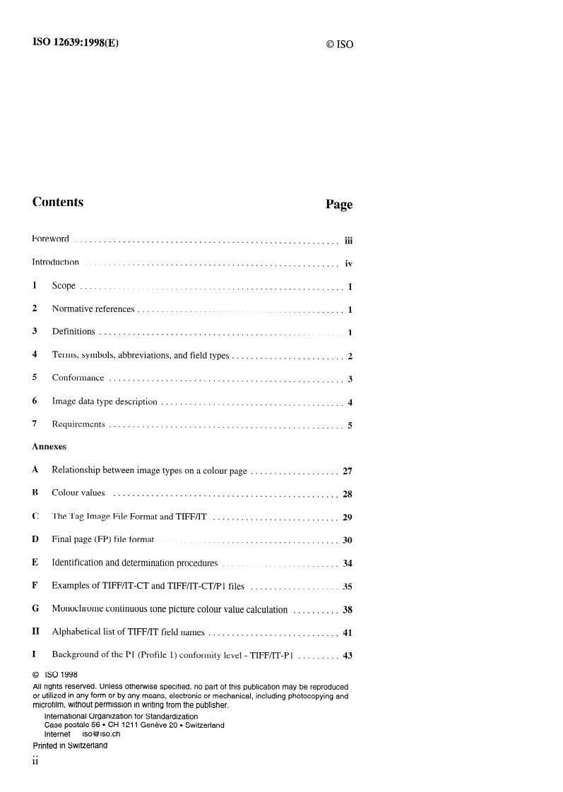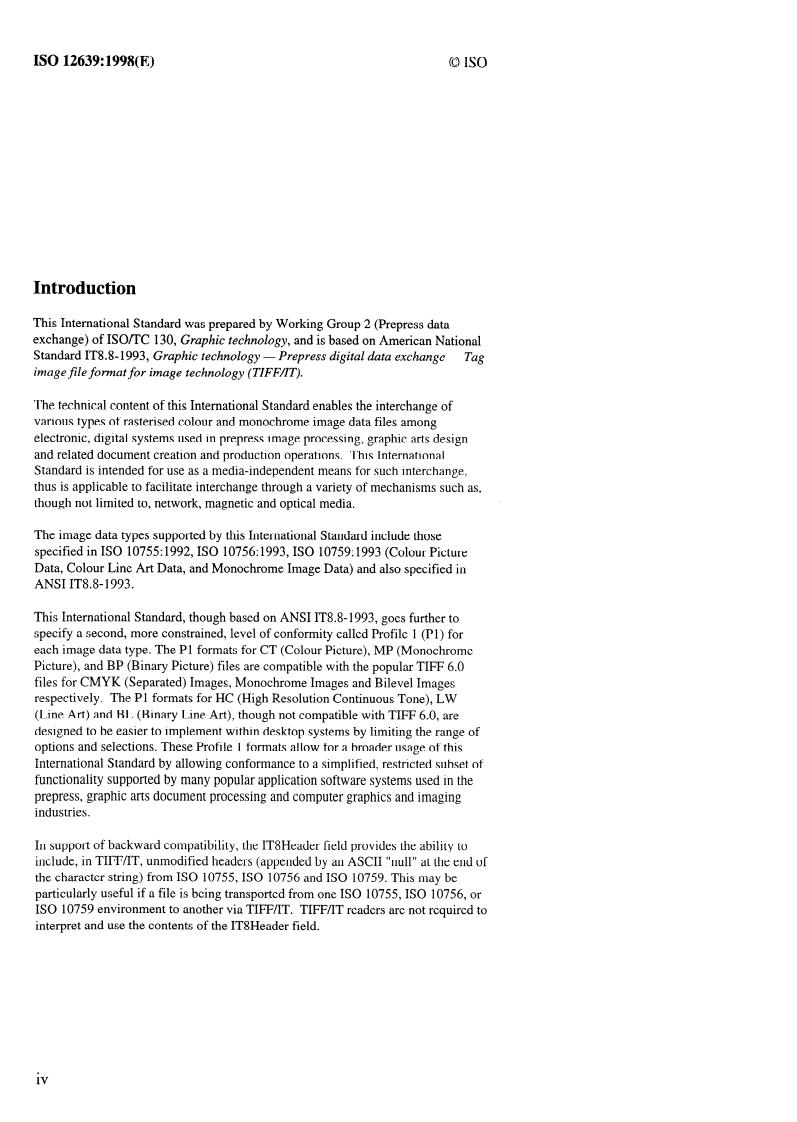 ISO 12639:1998 is a standard published by the International Organization for Standardization (ISO). Its full title is "Graphic technology — Prepress digital data exchange — Tag image file format for image technology (TIFF/IT)". This standard covers: Graphic technology — Prepress digital data exchange — Tag image file format for image technology (TIFF/IT)