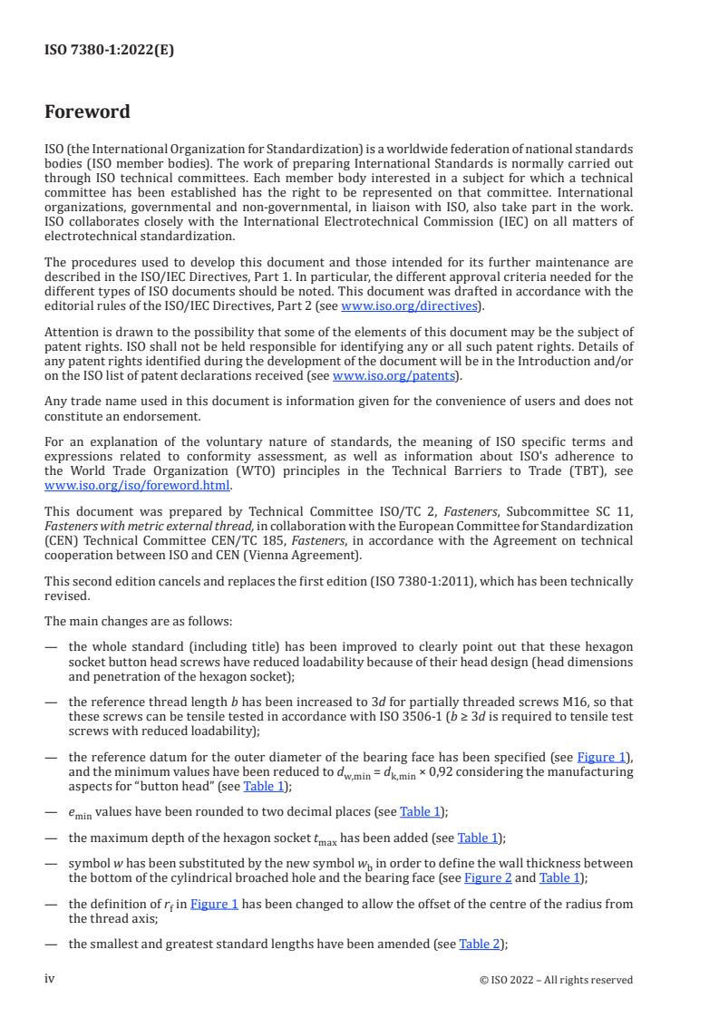 ISO 7380-1:2022 is a standard published by the International Organization for Standardization (ISO). Its full title is "Fasteners - Button head screws with reduced loadability - Part 1: Hexagon socket button head screws". This standard covers: This document specifies the characteristics of hexagon socket button head screws with reduced loadability due to head design, in steel and stainless steel, with metric coarse pitch threads M3 to M16, and with product grade A. If, in certain cases, other specifications are requested, stainless steel grades can be selected from ISO 3506-1, and the dimensional options from ISO 888 or ISO 4753. NOTE The reduced loadability (related to the head dimensions in combination with penetration of the hexagon socket specified in this document) implies a limitation of ultimate tensile load shown by a specific marking (property class preceded by a zero). The loadability in the head is assumed to be 80 % of that in the thread for all sizes and all property classes, see Table 4.