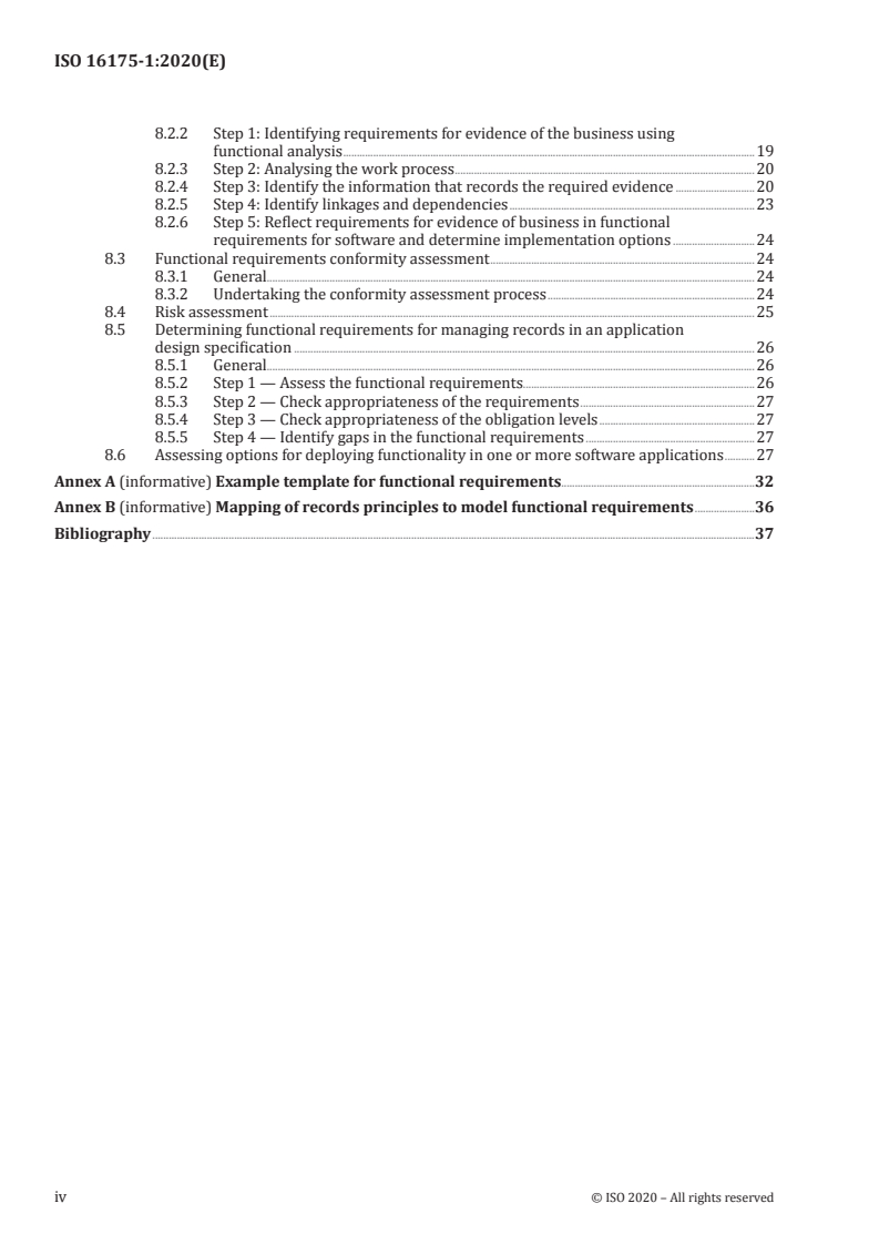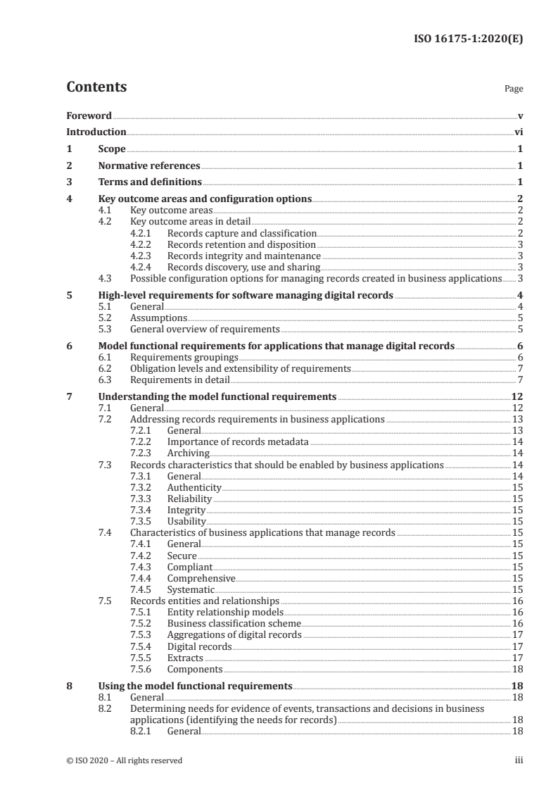 This document provides model, high-level functional requirements and associated guidance for software applications that are intended to manage digital records (including digital copies of analogue source records), either as the main purpose of the application or as a part of an application that is primarily intended to enable other business functions and processes. It does not include: — functional requirements for applications that manage analogue records; — generic design requirements such as reporting, application administration and performance; — requirements for the long-term preservation of digital records in a dedicated preservation environment; NOTE The model requirements are intended to encourage the deployment of applications that do not hinder long-term preservation of records. As such, some of the requirements support long-term digital preservation outcomes. — implementation guidance for applications that manages analogue and/or digital records. Such guidance can be found in ISO/TS 16175-2:—[1]. [1] Under development. Stage at the time of publication: ISO/DTS 16175-2:2020.