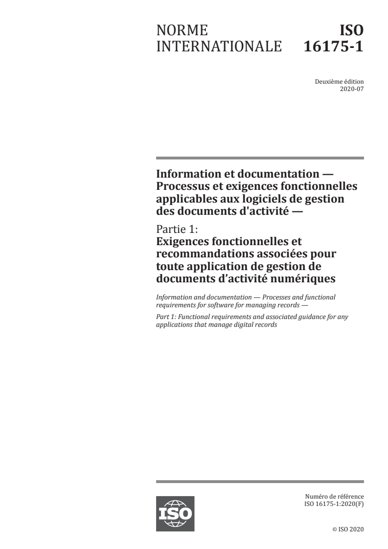 ISO 16175-1:2020 - Information et documentation -- Processus et exigences fonctionnelles applicables aux logiciels de gestion des documents d'activité