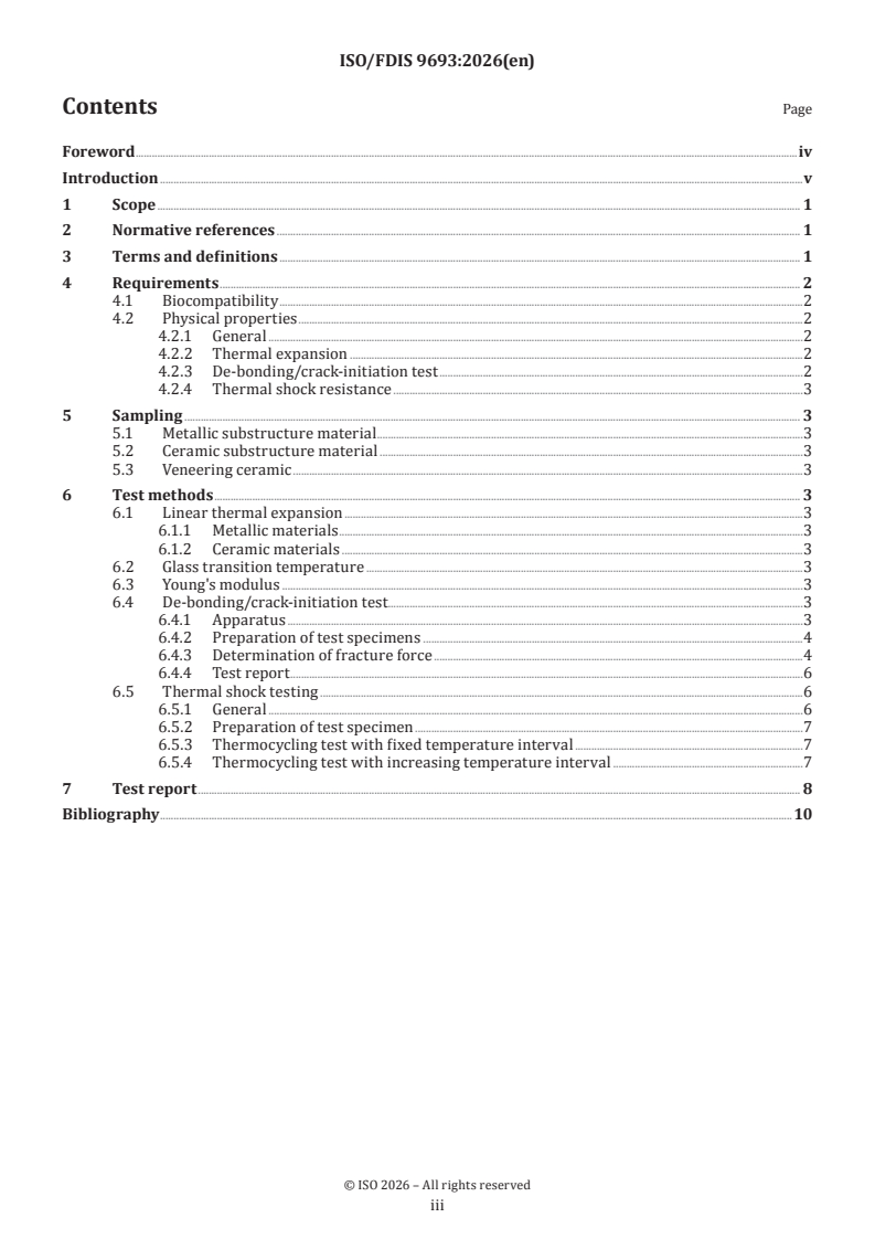 ISO/FDIS 9693:2026 is an international standard developed by ISO Technical Committee ISO/TC 106/SC 2/WG 1, focusing on dentistry compatibility testing for metal-ceramic and ceramic-ceramic systems. This standard specifies requirements and test methods designed to evaluate the thermomechanical compatibility between veneering ceramics and metallic or ceramic substructure materials used in dental restorations. Its scope is limited to the combined material systems rather than individual materials alone.