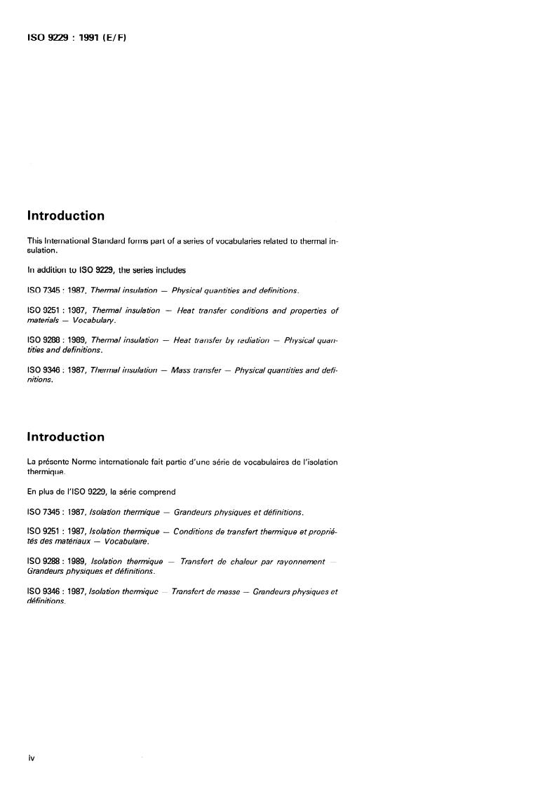 ISO 9229:1991 is a standard published by the International Organization for Standardization (ISO). Its full title is "Thermal insulation — Materials, products and systems — Vocabulary". This standard covers: Gives terms and definitions in English and French. Refers to ISO 7345, ISO 9251, ISO 9288, and ISO 9346. Annexes A, B and C form an integral part of this standard.