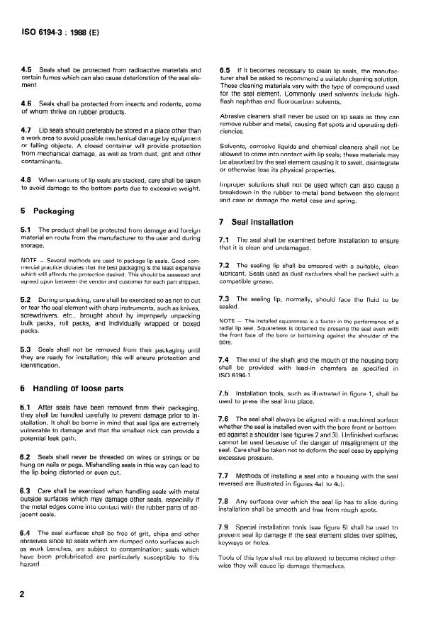 ISO 6194-3:1988 is a standard published by the International Organization for Standardization (ISO). Its full title is "Rotary shaft lip type seals — Part 3: Storage, handling and installation". This standard covers: This part gives lip seal users a guidance; attention is drawn to the hazards involved (temperature, ozone, humidity, radioactive materials, fumes, insects, rodents, dust, grit, mechanical damage) and ways of avoiding them are pointed out. The installation of the various types of seals by means of an installation tool is described and illustrated (figures 1 to 6).