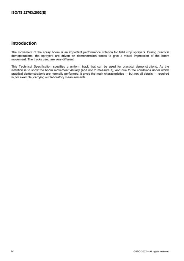 ISO/TS 22763:2002 specifies a uniform demonstration track for showing the spray boom movement of field crop sprayers in practical demonstrations and the like. The track specified can be used in demonstrations of mounted, trailed or self-propelled sprayers.