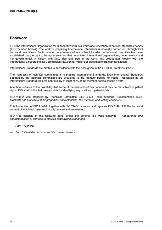 ISO 7146-2:2008 is a standard published by the International Organization for Standardization (ISO). Its full title is "Plain bearings — Appearance and characterization of damage to metallic hydrodynamic bearings — Part 2: Cavitation erosion and its countermeasures". This standard covers: ISO 7146-2:2008 defines, describes and classifies the characteristics of damage occurring in service in hydrodynamically lubricated metallic plain bearings due to cavitation erosion, together with possible countermeasures. It assists in understanding the various characteristic forms of damage which may occur. Consideration is restricted to damage which has a well-defined appearance and which can be attributed to particular causes with a high degree of certainty. Various appearances are illustrated with photographs and diagrams.