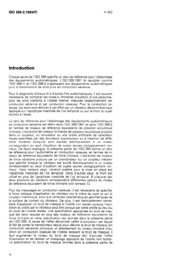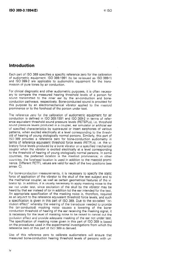 ISO 389-3:1994 is a standard published by the International Organization for Standardization (ISO). Its full title is "Acoustics — Reference zero for the calibration of audiometric equipment — Part 3: Reference equivalent threshold force levels for pure tones and bone vibrators". This standard covers: Specifies the following data applicable to the calibration of bone vibrators for pure-tone bone-conduction audiometry: reference equivalent threshold force levels (RETFL), corresponding to the threshold of hearing of young otologically normal persons by bone-conduction audiometry; essential characteristics of the bone vibrator and of its method of coupling to a person under test and to the mechanical coupler; essential characteristics and datum level of the masking noise applied to the ear not under test.