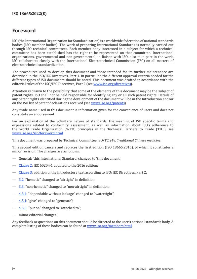 ISO 18665:2022 is a standard published by the International Organization for Standardization (ISO). Its full title is "Traditional Chinese medicine - Herbal decoction apparatus". This standard covers: This document specifies the general requirements of herbal decoction apparatus with design pressures less than 0,1MPa. It includes both hermetic and non-hermetic decoction apparatus. This document is applicable to herbal decoction apparatus for individual herbal formula prescriptions and for commercial use as well as private use. It also applies to the decocting part of the integrated apparatus of decoction and package.