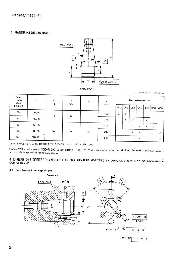 ISO 2940-1:1974 - Fraises a surfacer et a surfacer et dresser, a montage direct sur nez de broches a conicité 7/24 -- Dimensions d'interchangeabilité -- Mandrins de centrage
