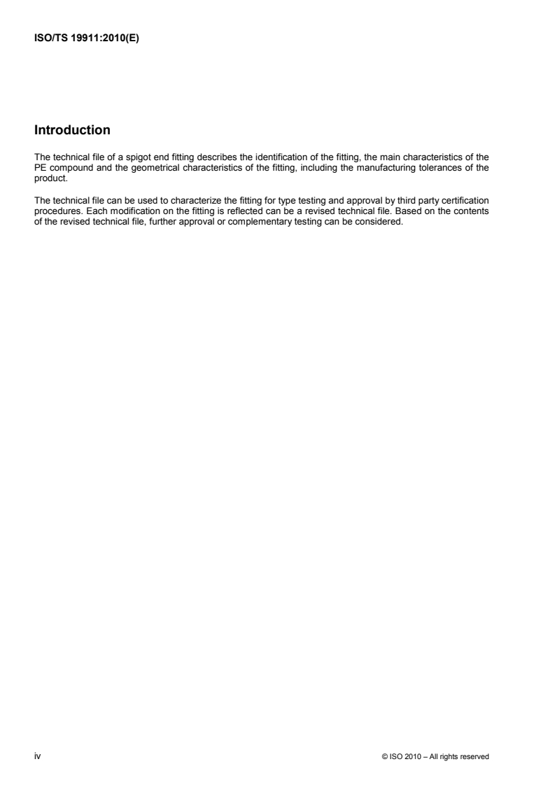 ISO/TS 19911:2010 is a technical specification published by the International Organization for Standardization (ISO). Its full title is "Plastics pipes and fittings - Format of a technical file for characterizing PE spigot end fittings". This standard covers: ISO/TS 19911:2010 describes the individual elements of a technical file, specifying the characteristics of fittings with spigot ends for butt fusion or electrofusion assembling.