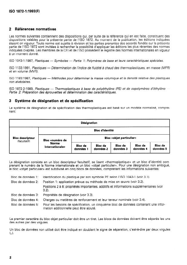 La présente partie de l'ISO 1872 établit un système de désignation des matériaux thermoplastiques polyéthylène qui peut être utilisé comme base pour les spécifications. Les types de plastiques polyéthylène sont différenciés les uns des autres par un système de classification basé sur des niveaux appropriés des propriétés de désignation a) masse volumique b) indice de fluidité à chaud en masse et des informations concernant l'application prévue et/ou la méthode de mise en ceuvre, les propriétés importantes, les additifs, colorants, matériaux de charge et renfort. La présente partie de l'ISO 1872 est applicable à tous les homopolymères polyéthylène et aux copolymères de l'éthylène ayant une teneur en autres monomères 1-oléfiniques inférieure à 50 % (m/m) et une teneur maximale de 3 % (m/m) en monomères non oléfiniques ayant des groupes fonctionnels. Elle s'applique aux matériaux prêts à l'emploi sous forme de poudres, grains ou granulés, non modifiés ou modifiés par des colorants, additifs, charges, etc. La présente partie de l'ISO 1872 ne s'applique ni aux mélanges-maîtres, ni au caoutchouc EPM. Le fait que des matériaux aient la même désignation n'implique pas qu'ils présentent nécessairement les mêmes performances. La présente partie de l'ISO 1872 ne comporte pas de données sur la conception, la performance ou les conditions de mise en oeuvre qui peuvent être exigées pour spécifier un matériau pour une application et/ou une méthode de mise en oeuvre particulière. Si de telles caractéristiques additionnelles sont nécessaires, elles doivent être déterminées conformément aux méthodes d'essai prescrites dans l'ISO 1872-2, si appropriée. Afin de prescrire un matériau thermoplastique pour une application particulière ou d'assurer une méthode de mise en oeuvre reproductible, des exigences additionnelles peuvent être codées dans le bloc de données 5 (voir article 3, alinéas d'introduction).