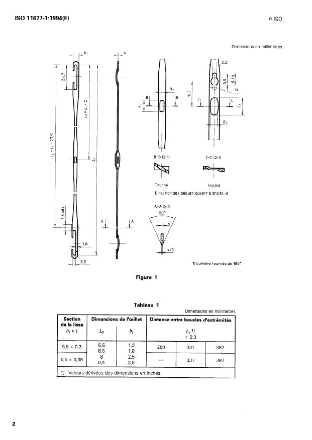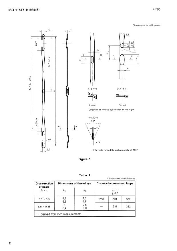 Keywords: ISO 11677-1:1994, flat steel healds, C-shaped end loops, textile machinery, heald dimensions, dimensional tolerances, loom healds, heald replacement parts.