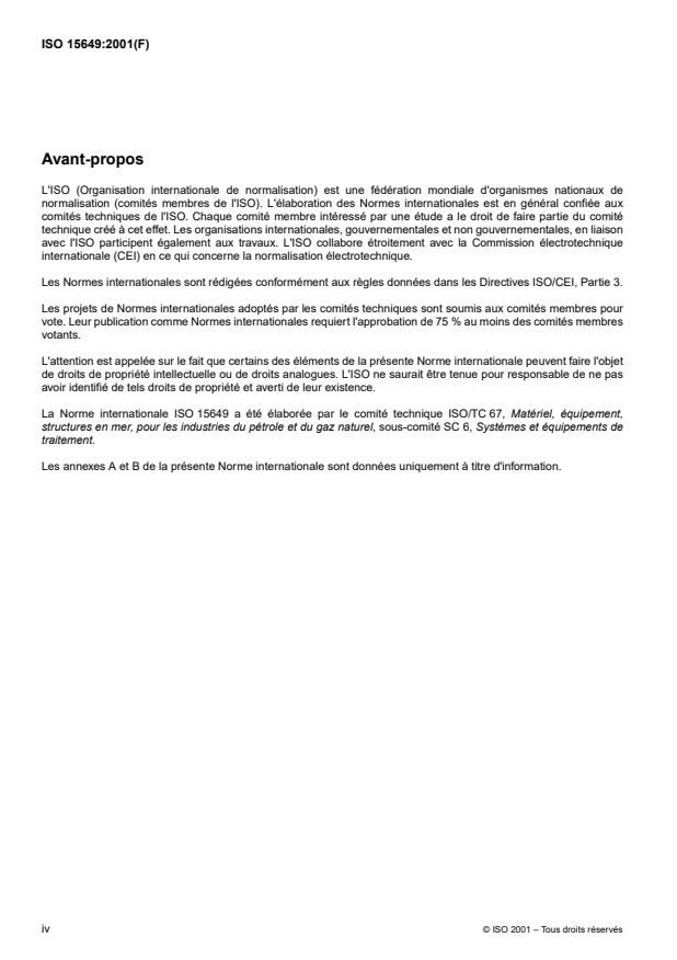 ISO 15649:2001 is a standard published by the International Organization for Standardization (ISO). Its full title is "Petroleum and natural gas industries — Piping". This standard covers: 1.1 This International Standard specifies the requirements for design and construction of piping for the petroleum and natural gas industries, including associated inspection and testing. 1.2 This International Standard is applicable to all piping within facilities engaged in the processing or handling of chemical, petroleum, natural gas or related products. EXAMPLE Petroleum refinery, loading terminal, natural gas processing plant (including liquefied natural gas facilities), offshore oil and gas production platforms, chemical plant, bulk plant, compounding plant, tank farm. 1.3 This International Standard is also applicable to packaged equipment piping which interconnects individual pieces or stages of equipment within a packaged equipment assembly for use within facilities engaged in the processing or handling of chemical, petroleum, natural gas or related products. 1.4 This International Standard is not applicable to transportation pipelines and associated plant. EXAMPLE Pipeline pump station, pipeline compressor station, pipeline tank farm, offshore platform risers up to and including pig launching facility.
