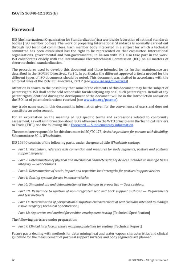 ISO/TS 16840-12:2015 is a technical specification published by the International Organization for Standardization (ISO). Its full title is "Wheelchair seating — Part 12: Apparatus and method for cushion envelopment testing". This standard covers: ISO/TS 16840-12:2015 specifies apparatus, test methods, and disclosure requirements for characterization of wheelchair seat cushion immersion and envelopment properties using instrumented indenters to characterize the interface pressure of each indenter and the test cushion by measuring the cushioning effects of immersion and envelopment. This part of ISO 16840 can be considered to expand the characterization of products intended to manage tissue integrity (ISO 16840‑2) and provide a standardized indenter for other wheelchair seating tests. It does not provide information specific to cushion performance for a particular individual user. ISO/TS 16840-12:2015 includes a method that is specific to 220 mm and 255 mm indenters. Dimensions and loads are provided for the 380 mm indenter to allow for extension of the methods for bariatric applications.