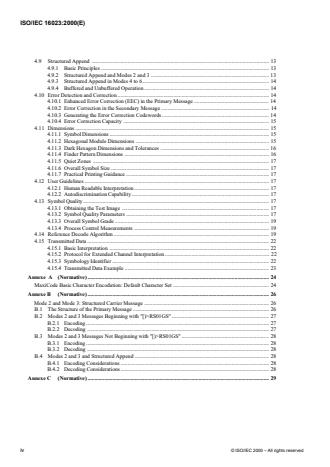 ISO/IEC 16023:2000 - MaxiCode defines the international specification for the MaxiCode 2D matrix symbology. MaxiCode is a fixed-size matrix of offset rows of hexagonal modules arranged around a unique finder pattern. The standard specifies the symbology’s characteristics, data encodation, symbol formats, dimensions, print quality requirements, error correction rules, a reference decoding algorithm, and user-selectable application parameters. It also includes special encodation modes for destination sortation used by carriers in the transport industry.