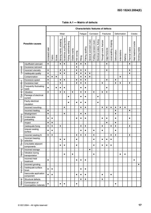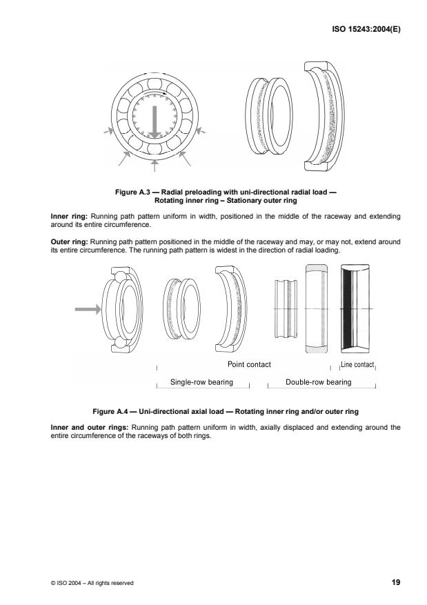 ISO 15243:2004 is a standard published by the International Organization for Standardization (ISO). Its full title is "Rolling bearings — Damage and failures — Terms, characteristics and causes". This standard covers: ISO 15243:2004 defines, describes and classifies the characteristics, changes in appearance and possible causes of failure of rolling bearings, occurring in service. It will assist in the understanding of the various forms of change in appearance and the failure that has occurred. Consideration is restricted to characteristic forms of change in appearance and failure, which have a well-defined appearance and which can be attributed to particular causes with a high degree of certainty. The features of particular interest for explaining changes and failures are described. The various forms are illustrated with photographs and diagrams, and the most frequent causes are indicated. The failure mode designations shown in the subclause titles are recommended for general use, but similar expressions or synonyms are given within parentheses below the titles. Examples of rolling bearing failures are given, together with a description of the causes of failure and proposed corrective actions.