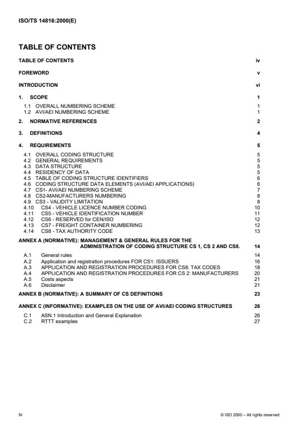 ISO/TS 14816:2000 is a technical specification published by the International Organization for Standardization (ISO). Its full title is "Road transport and traffic telematics — Automatic vehicle and equipment identification — Numbering and data structure". This standard covers: Road transport and traffic telematics — Automatic vehicle and equipment identification — Numbering and data structure