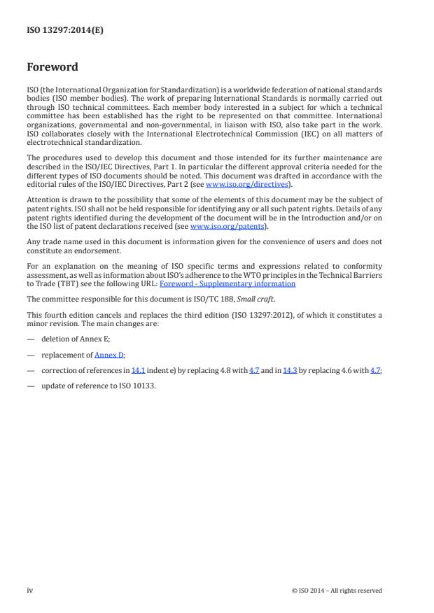 ISO 13297:2014 is a standard published by the International Organization for Standardization (ISO). Its full title is "Small craft - Electrical systems - Alternating current installations". This standard covers: ISO 13297:2014 specifies the requirements for the design, construction and installation of low-voltage alternating current electrical systems which operate at nominal voltages of less than 250 V single phase on small craft of hull length up to 24 m. Additional information to be included in the owner's manual is listed.