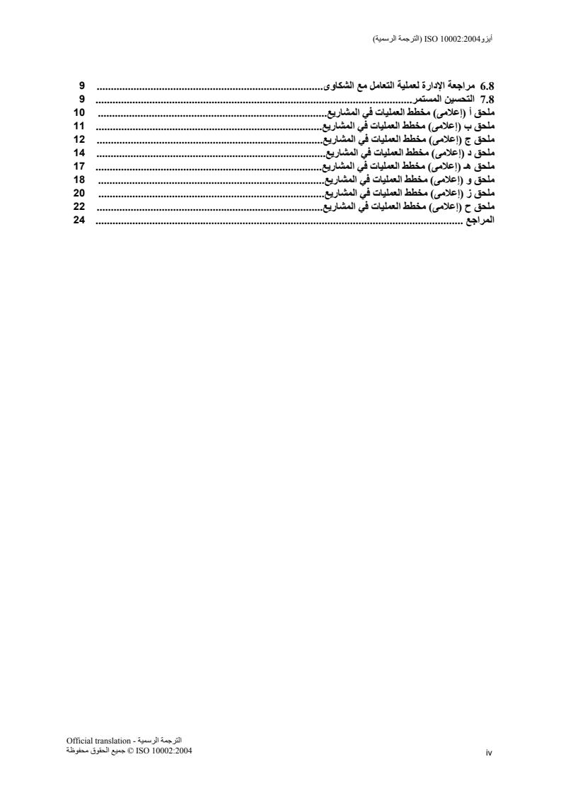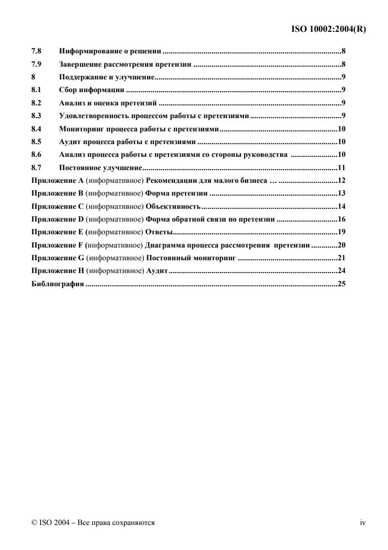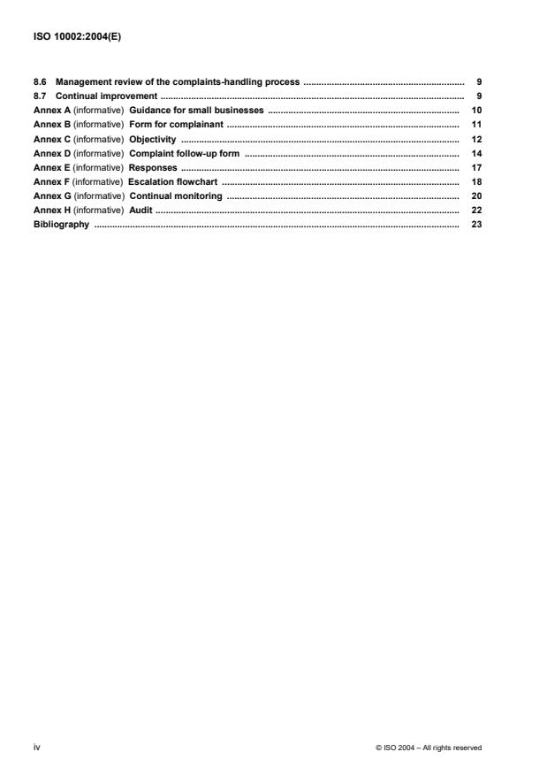 ISO10002:2004(E)iv© ISO2004–All rights reserved8.6Management review of the complaints-handling process . 98.7Continual improvement . 9AnnexA(informative)Guidance for small businesses . 10AnnexB(informative)Form for complainant . 11AnnexC(informative)Objectivity . 12AnnexD(informative)Complaint follow-up form . 14AnnexE(informative)Responses . 17AnnexF(informative)Escalation flowchart . 18AnnexG(informative)Continual monitoring . 20AnnexH(informative)Audit . 22Bibliography . 23