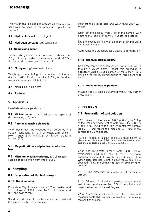 ISO 9006:1994 is a standard published by the International Organization for Standardization (ISO). Its full title is "Uranium metal and uranium dioxide powder and pellets - Determination of nitrogen content - Method using ammonia-sensing electrode". This standard covers: Specifies an analytical method for determining the nitrogen content in uranium metal and uranium dioxide powder and pellets. Applicable to the determination of nitrogen, present as nitride.
