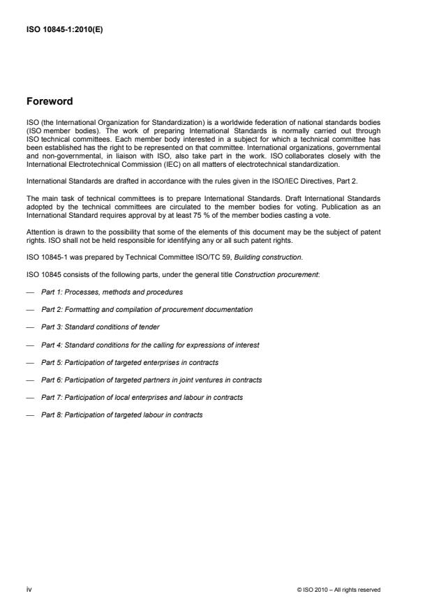 ISO 10845-1:2010 is a standard published by the International Organization for Standardization (ISO). Its full title is "Construction procurement — Part 1: Processes, methods and procedures". This standard covers: ISO 10845-1:2010 describes processes, methods and procedures for the establishment within an organization of a procurement system that is fair, equitable, transparent, competitive and cost-effective. ISO 10845-1:2010 describes generic procurement processes around which an employer can develop its procurement system, establishes basic requirements for the conduct of an employer's employees, agents, board members and office bearers when engaging in procurement, establishes the framework for the development of an employer's procurement policy, including any secondary procurement policy, and establishes generic methods and procedures for procurements, including those pertaining to disposals.