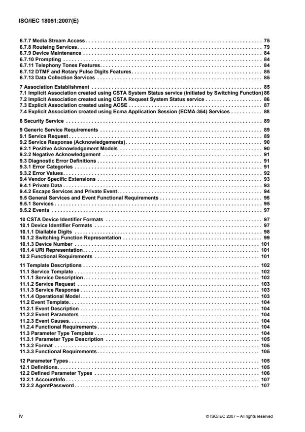 ISO/IEC 18051:2007 specifies the Services and Event Reports for Computer-Supported Telecommunications Applications, Phase III (CSTA). ISO/IEC 18051:2007 is focused on providing application service interfaces to a Switching Function, Computing Function and a Special Resource Function. A CSTA application interface is disassociated from the various user-network interfaces and network-network interfaces CSTA applications may serve, observe or manipulate. Because CSTA operates with existing telecommunications interfaces indirectly, it operates generically, so that differences among various existing interfaces are hidden from CSTA applications. Support of user-to-network interfaces is outside the scope of CSTA. Although most terminal equipment (TE) is suitable for use with CSTA, there will be instances of TE that will not be suitable in certain circumstances. Examples are: FAX terminals and modems that are unable to adjust their transmission modes to prevent carrier conflict when both parties are alerted via CSTA during call establishment; functional terminals that perform telecommunication functions outside the control of the Switching Function. Services defined in ISO/IEC 18051:2007 allow functional integration between a computing network and a telecommunications network. Computing platforms (i.e. application programming interfaces - APIs) that support such functionally-integrated applications are outside the scope of ISO/IEC 18051:2007. Communication between the computing and switching (i.e. telecommunications) networks may take place via intervening networks ranging from simple point-to-point connections to local- or wide-area telecommunications networks. ISO/IEC 18051:2007 is part of a suite of CSTA Standards and Technical Reports that provide a comprehensive description of the architectural and practical issues involved in applying, implementing, and utilizing CSTA-based computer telephony integration (CTI) applications.