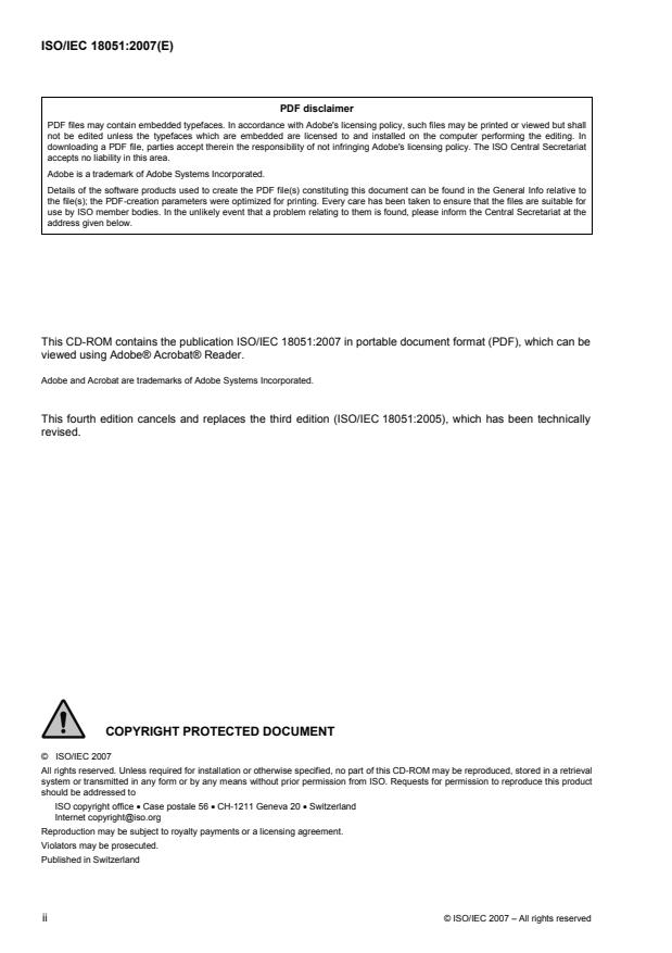This CD-ROM contains the publication ISO/IEC 18051:2007 in portable document format (PDF), which can be