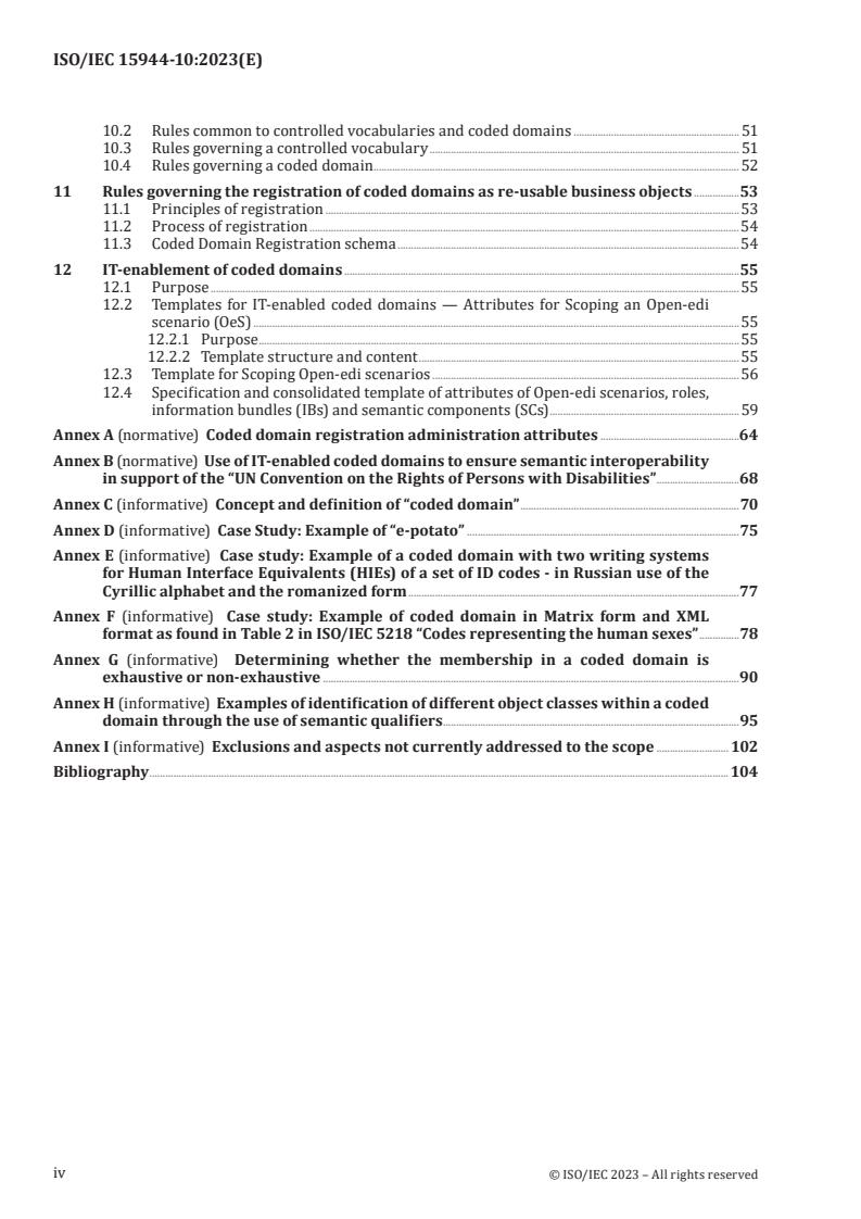 ISO/IEC 15944-10:2023 is a standard published by the International Organization for Standardization (ISO). Its full title is "Information technology - Business operational view - Part 10: IT-enabled coded domains as semantic components in business transactions". This standard covers: This document specifies the fundamental principles governing coded domains, identification and description of the coded domains from the BOV view, the rules governing the rule-base of coded domains, the rules for management of ID codes, rules for specifying Human Interface Equivalents (HIEs) to an ID Code, the relations between the coded domain and controlled vocabularies, the rules governing the registration of coded domains as re-usable business objects, and the IT-enablement of coded domains. The document is applicable to the use of standards, specifications, authority files, etc., of a “codes representing X” nature being used in electronic business transactions among parties engaged in Open-edi, which pertains to flows of information using information bundles which cause pre-defined (or pre-definable) changes in the states of the IT systems of the parties to such electronic data interchanges. Detailed exclusions to the scope of this document are provided in Annex I.
