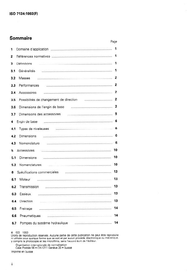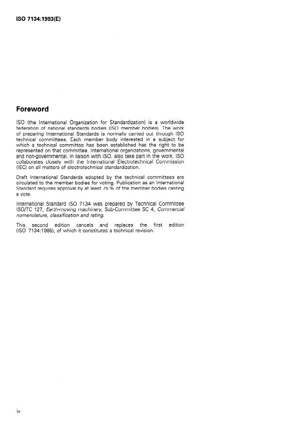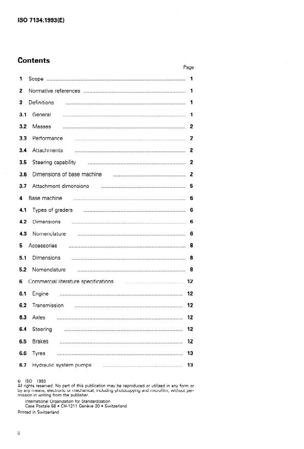 ISO 7134:1993 is a standard published by the International Organization for Standardization (ISO). Its full title is "Earth-moving machinery — Graders — Terminology and commercial specifications". This standard covers: Establishes terminology and the content of commercial literature specifications for self-propelled graders and their equipment. Applies to graders as defined in ISO 6165. Covers the base machine, attachments, and performance terminology and contains two annexes.