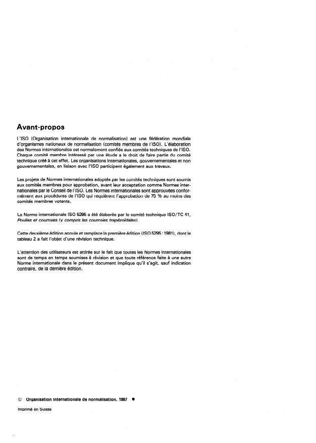 ISO 5295:1987 is a standard published by the International Organization for Standardization (ISO). Its full title is "Synchronous belts — Calculation of power rating and drive centre distance". This standard covers: This second edition cancels and replaces the first edition (1981). Establishes formulae for the calculation of power synchronous belts on two pulley drives. The numerical values of certain parameters used in the calculation depend upon the pitch and the construction of the belt and shall be specified by the belt manufacturer.