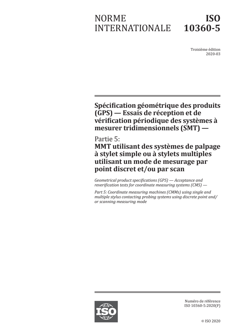 ISO 10360-5:2020 - Spécification géométrique des produits (GPS) — Essais de réception et de vérification périodique des systèmes à mesurer tridimensionnels (SMT) — Partie 5: MMT utilisant des systèmes de palpage à stylet simple ou à stylets multiples utilisant un mode de mesurage par point discret et/ou par scan Released:3/31/2020