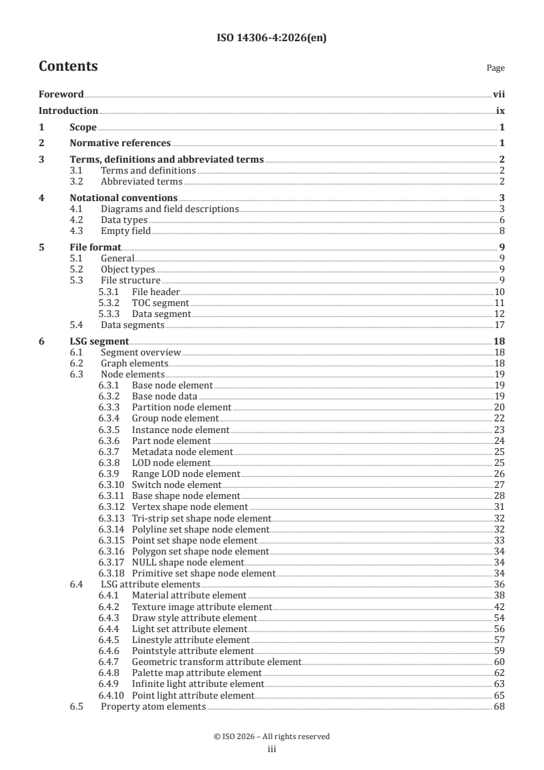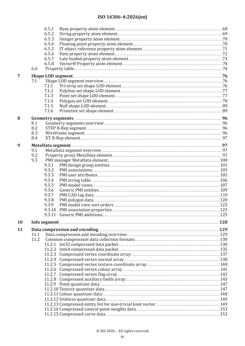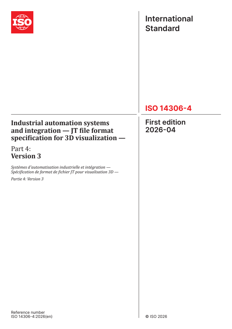 ISO 14306-4:2026 is a standard published by the International Organization for Standardization (ISO). Its full title is "Industrial automation systems and integration — JT file format specification for 3D visualization — Part 4: Version 3". This standard covers: This document defines the syntax and semantics of a file format for the 3D visualization and interrogation of lightweight geometry and product manufacturing information derived from CAD systems, using visualization software tools that do not need the full capability of a CAD system. This document has been adopted as a 3D visualization capability in addition to the ISO 10303 series. The ISO 10303 series are the ISO standards adopted for the engineering data exchange, sharing and long-term archiving of product definition information throughout the product lifecycle. In this document 3D visualization is defined as the visual presentation on a screen or another media of graphical and textual 3-dimensional representations of a set of data representing an object, information or results of a computational process in order to enable decision process by a human looking at the data visualized in a medium. The ISO 14306 file format specification for 3D visualization includes data descriptions that can represent the following data: facet information (triangles), stored with geometry compression techniques; visual attributes such as lights, textures and materials; product manufacturing information (PMI); boundary representation (b-rep) solid model shape representation and associated metadata; configuration representations; and delivery methods such as asynchronous streaming of content. The file format specification for 3D visualization does not specify the implementation of, or definition of a run-time architecture for viewing and/or processing ISO 14306 data.