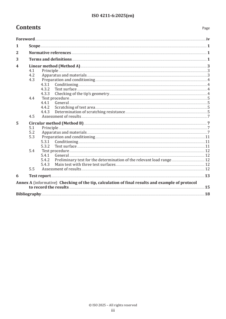 Keywords: ISO 4211-6:2025, furniture surface finishes, resistance to scratching, scratch resistance test, Method A, Method B, test panels, scratching tip, conditioning, optical measurement.